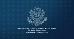 بالنيابة عن الولايات المتحدة الأميركية، أتقدم بأطيب تمنياتي وخالص تهانيّ لشعب لبنان بمناسبة الذكرى الـ 82 لاستقلاله. لقد اتخذت حكومة لبنان هذا العام خطوات شجاعة من أجل مستقبل أكثر إشراقًا للشعب اللبناني. والولايات المتحدة ستظل إلى جانب لبنان كشريكٍ له، بينما نعمل معًا من أجل تعزيز الاستقرار والازدهار الاقتصادي في …
